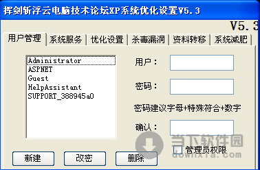 挥剑斩浮云系统优化设置是一款基于window xp系统的优化工具,包括用户管理、系统服务、优化设置、杀毒漏洞、资料转移、备份还原等实用功能,是优化系统的好工具。