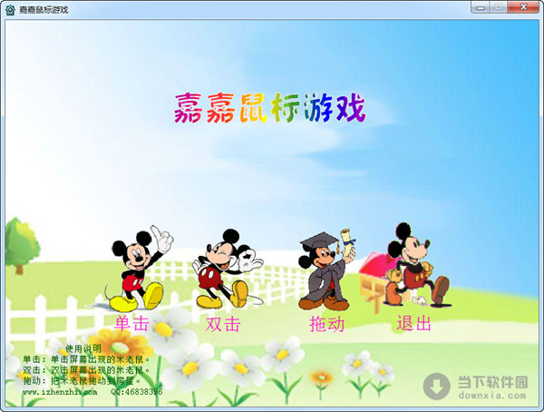 1、单击:在草地上不断出现许多米老鼠,用鼠标光标对准它时,光标会变成了手形,马上单击左键。单击成功,在屏幕上的右上角显示成绩和剩余的时间。每单击一次成功加1分,练习时间是1分钟。