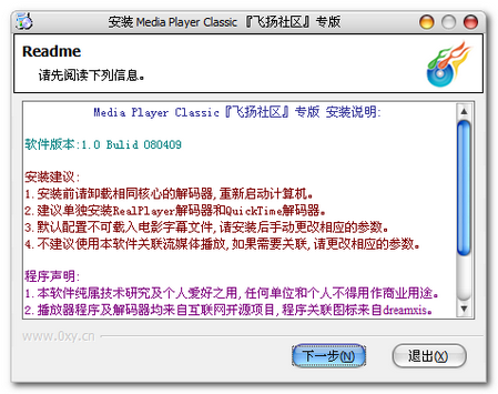 本版特点:集成常见的解码器,支持网络上常用媒体格式,特别添加对CSF格式的支持,针对飞扬社区设计的软件徽标,更新播放器版本为6.4.9.1,更新部分解码器,更新MediaInfo媒体检测等。目前版本进行测试,如果没有反馈问题和信息即可做为正式版本。