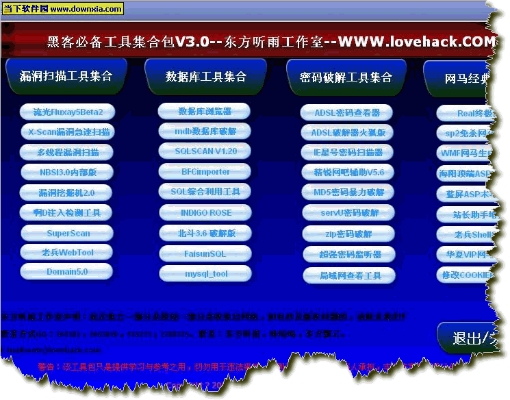 黑客漏洞扫描工具集成,数据库工具集成,密码破解工具集成,网马经典集合。